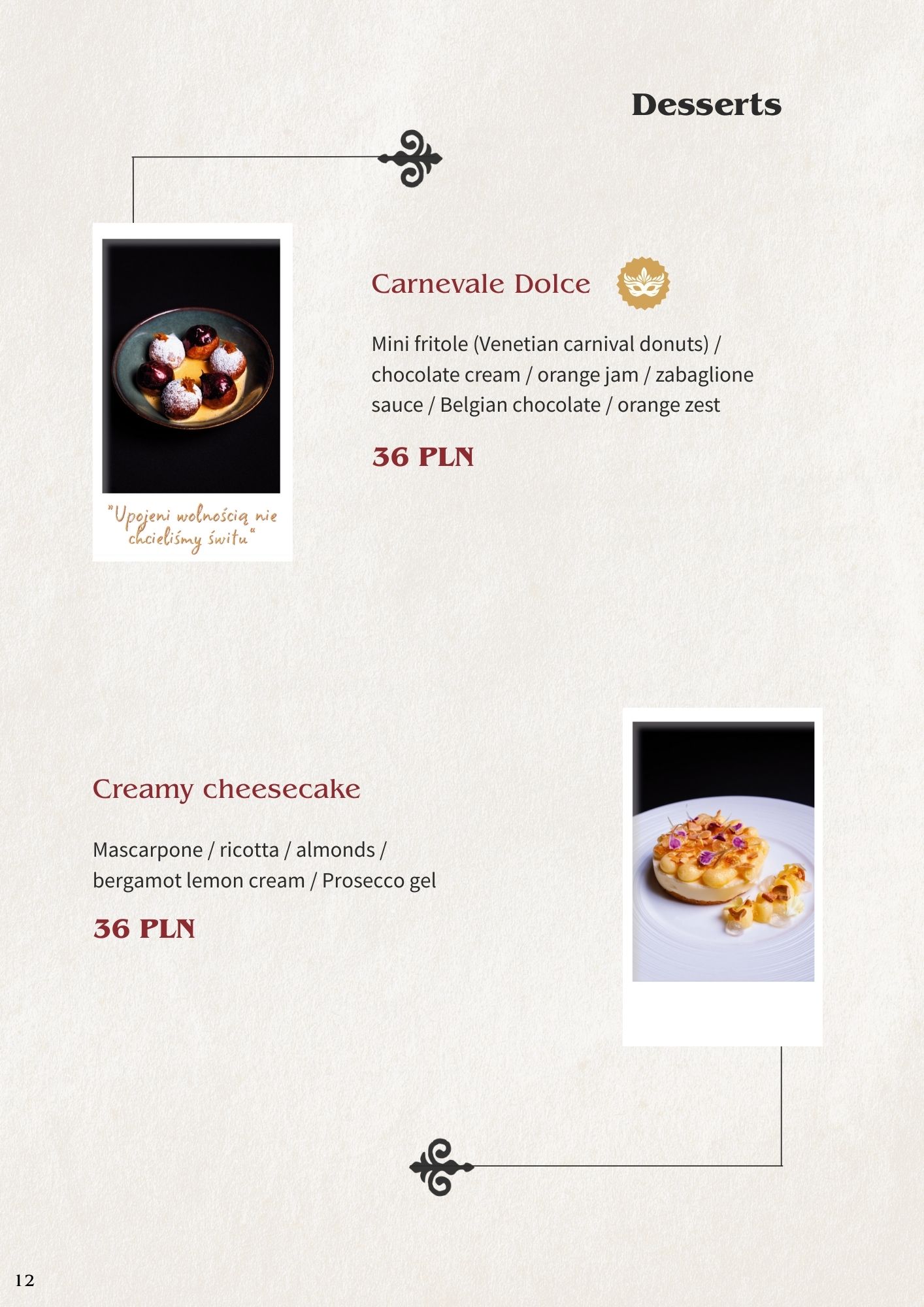 Make yourself comfortable and let us take you to 18th-century Venice. To a night when the city becomes the stage for a carnival ball. It is a time when boundaries fade away and every moment becomes part of a spectacle. Candlelight and reflections glinting off masks fill the interiors, music guides footsteps across the dance floor, and anonymity grants a freedom rarely spoken of in everyday life. Glances mean more than words, and gestures linger in memory longer than names. We invite you to an evening inspired by the magic of the Venetian Carnival — full of mystery, sensuality, and theatrical flair, where every guest becomes part of the story.